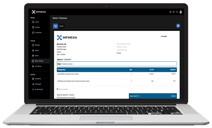 Crée, envoie et suis tes devis et factures directement depuis ton compte Infinexia.